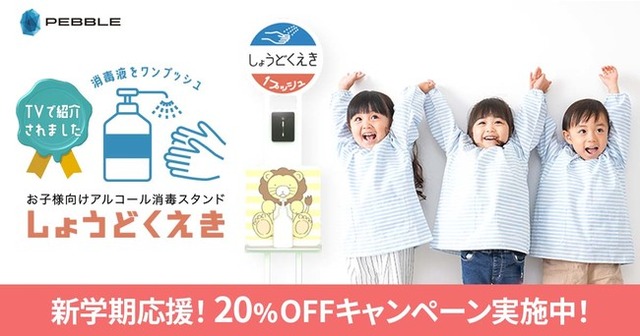 子供たちの体調の変化に常に気を配る先生方の負担軽減に少しでもなれるよう、ペブルコーポレーションでは【新学期応援キャンペーン】として公式ショップ及びAmazonショップにて、お子様向けアルコール消毒スタンド『しょうどくえき』の20%OFFキャンペーンを本日より開始いたしました。