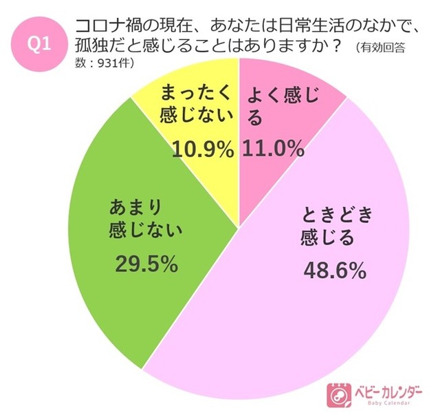 現在妊娠中または育児中のベビーカレンダー会員のママ931名に「コロナ禍の現在、あなたは日常生活のなかで、孤独だと感じることはありますか?」と質問したところ、「よく感じる」11.0%、「ときどき感じる」48.6%と、約6割のママが孤独を感じていると回答しました(Q1)。