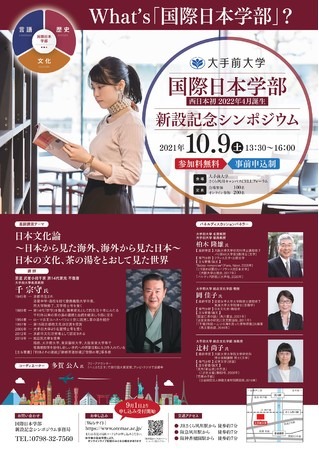 大手前学園 (本部:大阪市中央区、理事長:福井要) は、本学の「歴史・言語・文化」の横断的な学びを強化することを目的とし、2022年4月、国際日本学部(総合文化学部より名称変更)を新設します。つきましては、学部新設に先立ち「国際日本学部 新設記念シンポジウム」を2021年10月9日(土)に開催します。