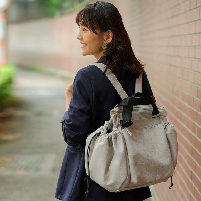 会計時にレジカゴにセットするだけでお買い物がスムーズに。両サイドのひもで口をしぼり、上部のファスナーを閉めればそのままバッグになります。リュックを背負うだけでスマートにお買い物が完了。見た目も買い物帰りとは思えないおしゃれで上品な雰囲気です。