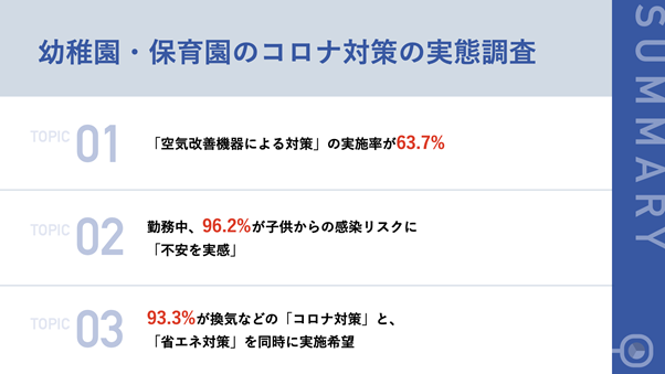 幼稚園・保育園のコロナ対策について、「子ども同士の接触は防げない」といった声が多く挙がったことからも、「空気改善機器」を取り入れた安心安全な保育運営が求められています。