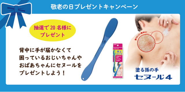ユースキン製薬株式会社(本社/神奈川県川崎市 代表/野渡和義)は、9月20日『敬老の日』に向けて、手の届かない背中にクリームやローションを塗る道具「セヌール4」が抽選で20名様に当たる、「敬老の日プレゼントキャンペーン」を実施いたします。期間は2021年9月8日(水)~9月13日(月)まで。