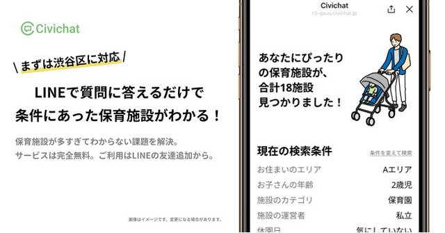 自分にあった公共制度をLINEで届けるサービスを運営する株式会社Civichat(本社:大阪府高槻市 / 代表取締役:高木俊輔)、2021年9月8日に「渋谷区の保育施設を探している方」向けにおすすめの保育施設がわかるサービス『Civichat〈渋谷区・保育施設〉』を提供開始したことを発表します。