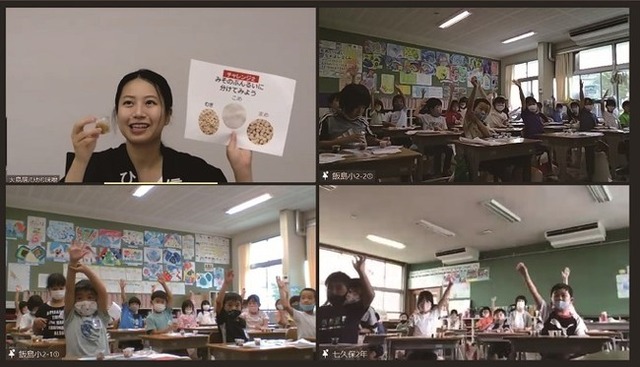5年目となる今回は、当社の飯島グリーン工場近くに位置する、飯島町立飯島小学校と飯島町立七久保小学校の小学2年生を対象に、オンラインで授業を行いました。これまでは、学校に出向いて直接子どもたちと触れ合いながら授業を行っていましたが、コロナ禍のために訪問はせず、オンラインで2校を結び、初の2校同時開催となりました。