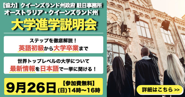 気候が良く日本との時差も少ないオーストラリア クイーンズランド州には、世界的に評価の高いクイーンズランド大学をはじめとし、さまざまな大学が存在します。多彩な魅力をもつ大学の情報を一挙に入手いただける場として、9月26日(日)14時~16時、クイーンズランド州の大学進学説明会を開催いたします。
