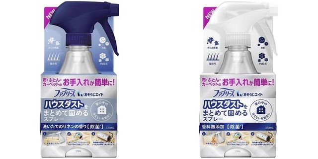 左から: 「ファブリーズ おそうじエイド ハウスダストをまとめて固めるスプレー 洗いたてのリネンの香り」、「ファブリーズ おそうじエイド ハウスダストをまとめて固めるスプレー 香料無添加」