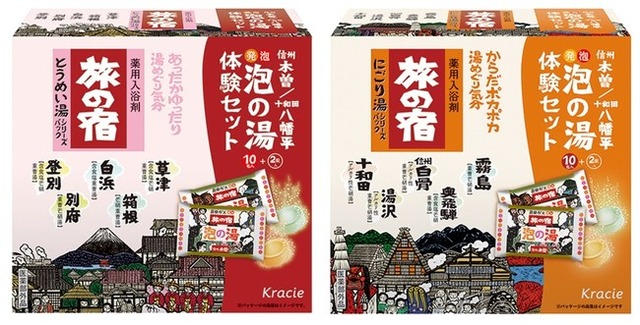 「旅の宿」の「シリーズパック(とうめい湯、にごり湯)」と、発泡タイプ「泡の湯」をセットにした限定商品