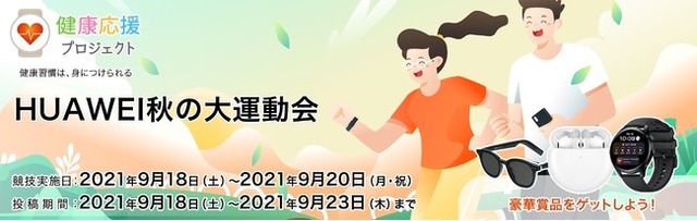 華為技術日本株式会社(ファーウェイ・ジャパン)は、ユーザー1人ひとりの健康的な生活を応援する「健康応援プロジェクト」の第三弾として、紅組・白組に分かれて4種目で競う「HUAWEI 秋の大運動会」を、2021年9月18日(土)~9月20日(月・祝)に開催します。