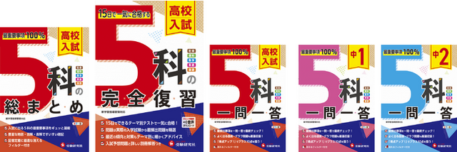 5科の総まとめ ※新商品の高校入試のほかに中1、中2の教材を発売しています。