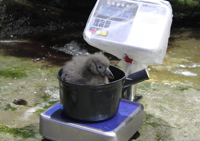 生後1ヶ月を迎えたエトピリカのヒナの体重は約500gで、性別はまだわかりません。1日に3回、飼育員の手からエサの魚を食べて、日に日に成長をしています。ヒナは全身がふわふわの黒い綿羽におおわれ、特徴であるくちばしは、親鳥が幅広で色鮮やかなオレンジ色をしているのに対し、細長く黒っぽい色をしています。普段はポーラーアドベンチャー「ピリカの森」に設置した巣箱の中で親鳥とともに1日を過ごしています。