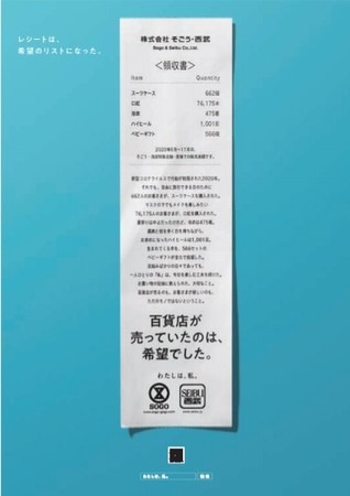 5年目となる2021年は「百貨店が売っていたのは、希望でした。」と題するコピーを中心にメッセージを展開しました。2020年はコロナ下でお客さまはもちろん、私たち従業員もさまざまな制約や不安を強いられた1年でした。しかしながらお客さまは、日々の生活を少しでも明るく楽しいものにするため、ご自分らしくさまざまな工夫をされ、制約のない自由な生活が戻ってくることを思い描きながら、百貨店でお買い物をされました。レシートに記載されたお買い物の記録はお客さまのそうした「希望」を象徴するものであると考え、レシートをメッセージに使用しました。コロナ下で制約がある中でも、自分たちの仕事を通じ、お客さまお一人お一人の希望を叶えるお手伝いをしたい。そうした私どもそごう・西武の思いを表したメッセージでもあります。