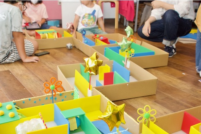 4、50分の間、集中力を切らすことなく没頭。隠し扉や凸凹、坂道…さまざまなトラップやコースを工夫を凝らし、楽しみながら作り上げる子どもたち。スタッフもこれは時間がいくらあっても足りないかも、と焦ったほど。