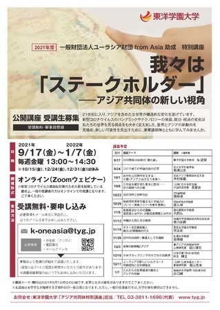 東洋学園大学(学校法人東洋学園 本部:文京区本郷 理事長:愛知太郎)は、一般財団法人ユーラシア財団from Asiaの助成による特別講座「我々は『ステークホルダー』-アジア共同体の新しい視角」をオンラインで開講します。毎回多彩な分野の専門家を講師として招聘し、全14回の講義を行います。本講座は本学学生が履修するほか、一般の方も受講可能な公開講座として開講します。(受講無料・要事前申し込み)
