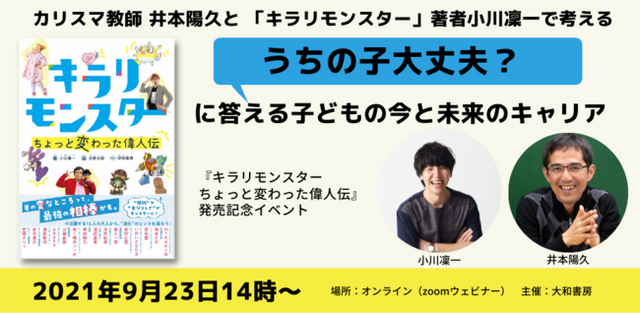 『キラリモンスター ちょっと変わった偉人伝』発売を記念して、2021年9月23日14時から、カリスマ教師 井本陽久と著者・教育企画者 小川凜一によるオンライントークイベントを実施いたします。