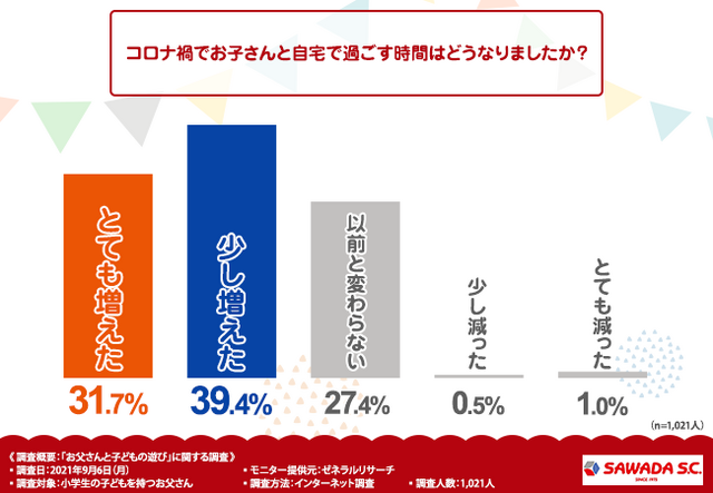 今回の調査で、約7割のお父さんが自宅でお子さんと過ごす時間が増えたということが分かりました。