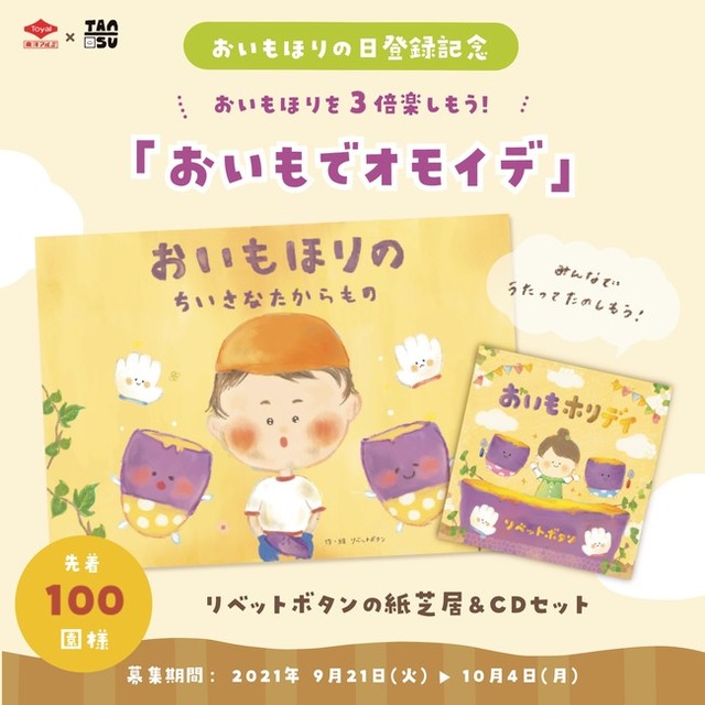 10月23日が二十四節気の霜降で、サツマイモ収穫の目安時期とされていることからこの日を選定。登録を記念し、おいもほりを3倍楽しんでもらうための「おいもでオモイデ」プレゼントキャンペーンを全国の保育園・幼稚園・認定こども園を対象に実施いたします。