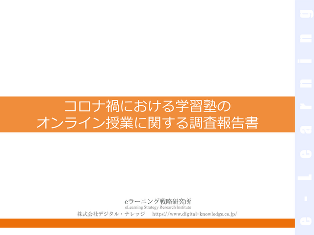 導入実績2000超を誇るeラーニング専門ソリューション企業、株式会社デジタル・ナレッジ(本社:東京都台東区、代表取締役社長:はが弘明)が運営するeラーニング戦略研究所は、関東・中部・関西地方の学習塾の経営者や講師らを対象に、オンライン授業の実施状況に関する調査を実施し、その結果をまとめた報告書を公開致しました。