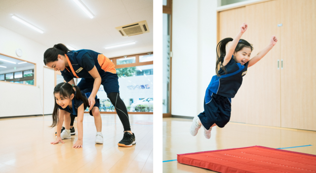 幼少期に必要な「神経系統の発達」のための効果的なプログラムとして、すべてのスポーツの土台となる9つの基本動作(走る・跳ぶ・投げる・打つ・捕る・蹴る・組む・バランス・リズム)を身につけるための、スポーツバイオメカニクスの研究成果を基に考案された300の運動プログラム「忍者300」が特長です。また、異学年合同プログラム「忍者バトル」を通じてリーダーシップや年下の子を思いやる気持ち、チームで考える力など社会性や協調性を育て、脳科学を基にした30のゲームにより自分で考える力を育てます。そのほか、動作分析シミュレーションシステム「スポーツ適性ナビ」を用い、お子さまの運動能力を総合的に判断し、どんな競技に向いているかを診断します。