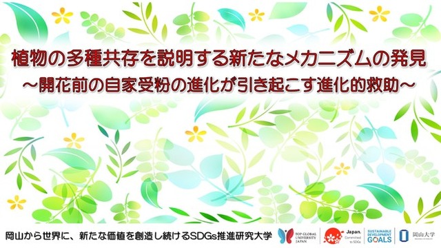 国立大学法人岡山大学(本部:岡山市北区、学長:槇野博史)学術研究院環境生命科学学域(工)の勝原光希助教(当時所属:神戸大学大学院人間発達環境学研究科)、東京都立大学大学院理学研究科の立木佑弥助教、理化学研究所数理創造プログラムの入谷亮介研究員(当時所属:University of California Berkeley, University of Exeter)、神戸大学大学院人間発達環境学研究科の丑丸敦史教授は、個体ベースモデルを用いたシミュレーションを行い、同じ種の送粉者を共有し競争関係にある植物2種において、個体数の少ない種でより高い自家受粉率が進化することで個体数が増加に転じる進化的救助が発生し、それによって2種の長期的な共存が促進されることを明らかにしました。