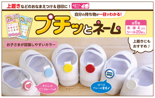 【プチッとネーム】は、今までKAWAGUCHIが培ってきた「現役ママが考えた!おなまえつけシリーズ」のノウハウが活かされた、取付けが簡単でパパ、ママにとって作業の負担が少なく、子どもが認識しやすいカラーで、一目で「自分の持ち物」がわかるおなまえつけグッズです。