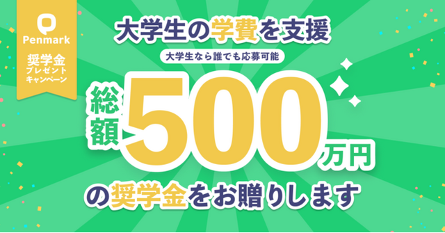 この度、秋学期を迎える学生たちに奨学金をお贈りすべく「【総額500万円】奨学金プレゼントキャンペーン」を開始いたします。「Penmark」アプリをインストール&2021年9月以降の時間割を登録すると、抽選で10万円が50名様に当たります。9月はこの他にもTwitter投稿キャンペーンも実施予定です。いずれも全学年対象なので、ぜひご参加ください。