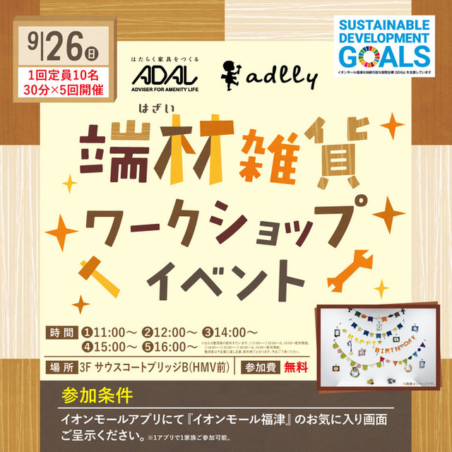イオンモールのSDGsWeekのキーワード「この街で、みんなで、できること。」に共感し、アダルが本社を置く福岡にあるイオンモール福津店にて開催されるワークショップに、自社開発した端材雑貨キットを提供する運びとなりました。地元メーカーとしてサスティナブルなものづくりを通して、地域の子供たちに楽しみながら環境や未来のことを考えるきっかけにして頂くことを目指します。