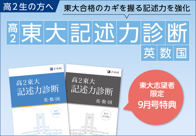 株式会社増進会ホールディングス(Z会グループ)のグループ会社である株式会社Z会は、「通信教育のZ会」高1・高2生向けコースにおいて、9月29日(水)までに9月号をお申し込みいただいた、東大志望の高2生を対象に、問題集『高2東大記述力診断』を限定特典としてプレセントします。