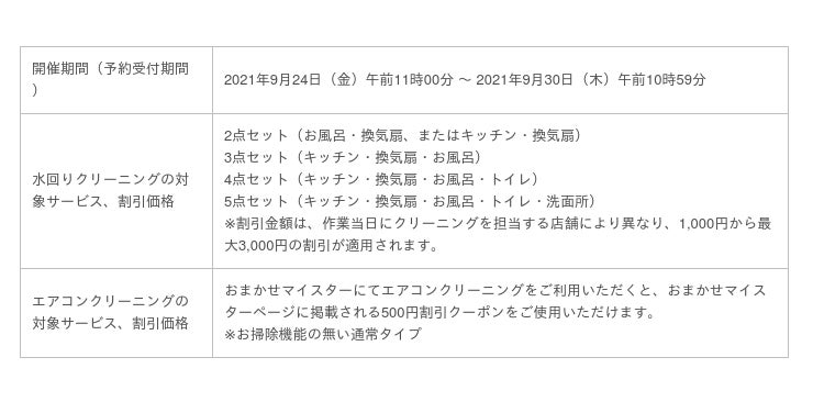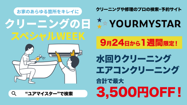 ハウスクリーニングやリペア等のサービス産業をIT化する日本最大級のプラットフォーム「ユアマイスター」を運営するユアマイスター株式会社(本社:東京都世田谷区、代表取締役:星野貴之)は、2021年9月24日(金)から9月30日(木)の7日間、お風呂・キッチン・換気扇をはじめとする水回りクリーニングや、エアコンクリーニングをお得にご利用いただける「クリーニングの日 スペシャルWEEK」(https://bit.ly/3im0pMr)を開催します。