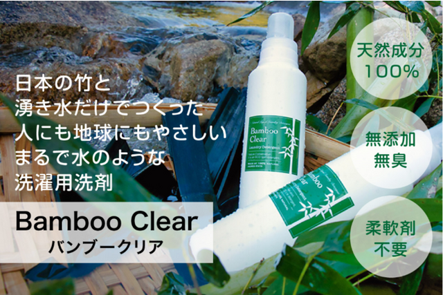 Bamboo Clear は、日本の竹からこだわりの自然抽出製法で、手間ひまかけてゆっくりていねいに作った、天然成分100%の無添加洗濯用洗剤です。