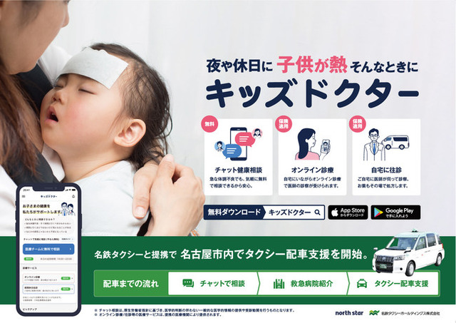 株式会社ノーススター(本社:東京都中央区、代表取締役社長:田北 浩大、以下「ノーススター」)と、名鉄タクシーホールディングス株式会社(本社:愛知県名古屋市、代表取締役社長:浅野丈夫、以下「名鉄タクシー」)は、時間外の小児医療相談アプリ「キッズドクター」のチャット健康相談機能内において、名古屋地域にお住まいの方向けに、お近くの救急病院までの交通手段となるタクシーの配車支援連携を2021年10月1日(金)より開始します。
