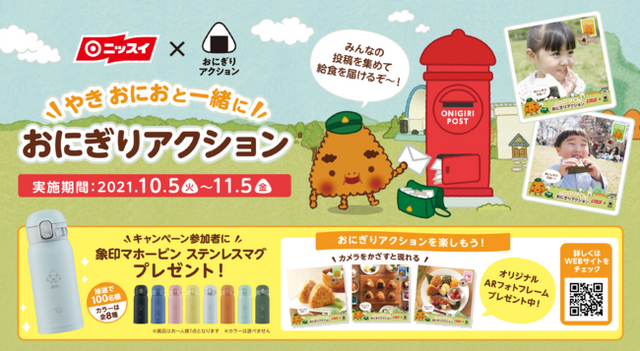 日本水産株式会社(代表取締役 社長執行役員 浜田 晋吾、東京都港区、以下ニッスイ)は、世界の食料問題解決に取り組む特定非営利活動法人 TABLE FOR TWO International(代表理事 小暮 真久、東京都港区、以下TFT)が開催する「おにぎりアクション2021※」の活動に賛同し、初協賛いたします。合わせて「やき おにおと一緒に おにぎりアクション」プレゼントキャンペーンを実施、特設WEBサイトを通じて「おにぎりアクション2021」について情報発信をします。