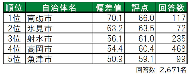 住み続けたい街1位は南砺市、2位は氷見市、3位は射水市。