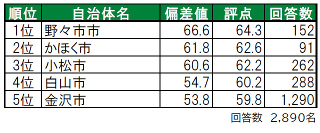 住み続けたい街1位は野々市市、2位はかほく市、3位は小松市。