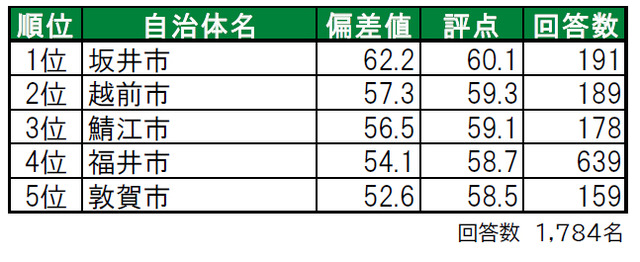 住み続けたい街1位は坂井市、2位は越前市、3位は鯖江市。