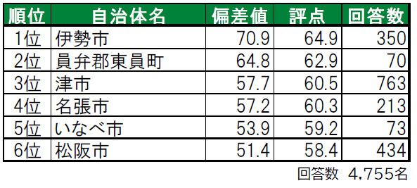 住み続けたい街1位は伊勢市、2位は員弁郡東員町、3位は津市。