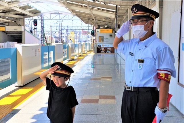 お仕事体験は、お子さまに制服と制帽を着用していただき、電車の出発合図やホームでのアナウンス等の体験、通常は触れることのできない駅ホーム内の設備を見学する等、駅係員のお仕事について学べる本プランでしか体験することのできない特別な内容となっております。
