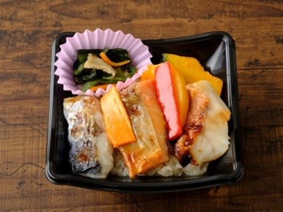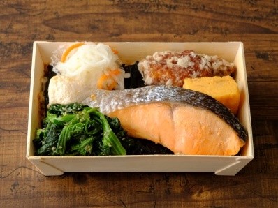 脂の乗った銀鮭と人気のあべ鶏ささみの竜田揚げが入った、魚と肉を楽しめるお弁当。