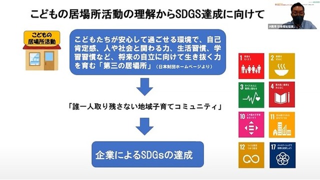 一方、企業等から子ども居場所活動(子ども食堂)支援=貧困支援というイメージに偏ってしまっているという課題意識を共有し、子どもの居場所活動は子どもの自立に向けた第三の居場所としての役割を担っており、活動への理解を深めていただく視点としてSDGsの目標と子どもの居場所活動と関わりについて説明しました。