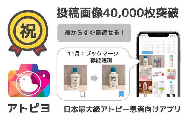 アトピヨ合同会社(所在地:千葉県市川市、代表:Ryotaro Ako)は、アトピーを持つ方々を対象とした匿名の画像共有型アプリ「アトピヨ」にて、簡単な症状記録やアトピー患者コミュニティの存在がユーザーに支持され、リリース3年後の2021年10月4日(月)に投稿画像が40,000枚を突破したことをお知らせします。また、今回の40,000枚突破に伴い、ユーザーの利便性をより高めるため、2021年11月にブックマーク機能を追加することをお知らせします。