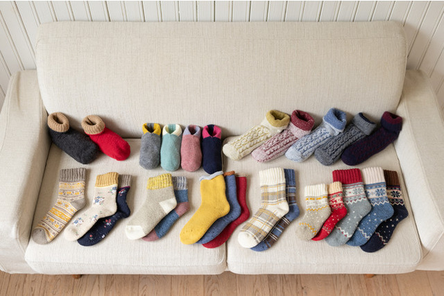 1,430円~1,540円(税込)と安価で手に取りやすく大人気のもこもこ裏起毛シリーズ 。毛混のアクリル糸を使用し、内側がタオルの様なパイル編みになるようにもっちりと肉厚に編み立てました。ふわふわに起毛させてあるので、空気をたっぷり含んで保温性も抜群。また、ゆったりとしてちょうど良いフィット感を採用しているので、ストレスがなくやわらかな履き心地です。今年は、毎年定番で人気の雪柄の新作や、おしゃれなチェック柄など多数取り揃えました。さらに、お子様用サイズも登場。親子やご家族お揃いでお楽しみいただけます。
