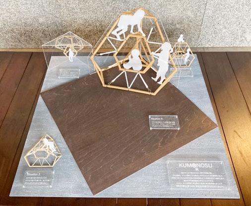 このたびの「第1回建築模型コンテスト」では、“子どものためのジャングルジム”をテーマとする建築模型を募集、全国から45点のご応募があり一時選考で8点に絞られ、お客様の人気投票と審査員による審査を経て受賞作が選出されました。最優秀賞作には、「KUMONOSU」が、優秀作には、「REGRESSION」、「ねじれてつながる」、「SUBAKO」、「紡ぐ -life cycle jungle gym-」、「無題」、「子供の棲家」、「WA」が選出されました。審査委員である東京工業大学特定教授の金箱温春氏は「同じものを異なる使い方、ぶら下がることもでき、伏せた置き方にして登ることもできる、パーツを組み替えて、ブランコにすることもできるといったように、豊富なバリエーションが可能なことが評価できます」と評しています。