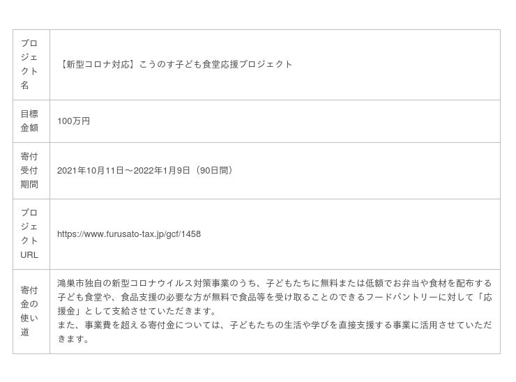 埼玉県鴻巣市と、鴻巣市のふるさと納税業務を受託している株式会社フューチャーリンクネットワーク(本社:千葉県船橋市、代表取締役:石井丈晴、以下FLN)は、新型コロナウイルス感染拡大により運営に打撃を受けている地域の「子ども食堂」を支援するためのふるさと納税型クラウドファンディングを、2021年10月11日に開始しました。