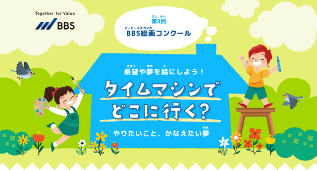 BBSは、次世代を担う子どもたちの創造力、表現力を育む機会の創出を目的とし、全国の小・中学生を対象に「BBS絵画コンクール」を開催しています。今回のテーマは「タイムマシンでどこに行く?」とし、子どもたちの夢や希望の詰まった作品を募集いたします。自分の想いを形にして是非表現してみてください。