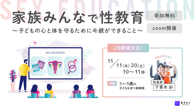 株式会社ネクイノ(大阪市北区、代表:石井健一)が運営するオンライン診察でピルを処方するアプリ「smaluna (※1)」(以下 スマルナ)にて、スマルナ相談室に所属する助産師による、「スマルナ助産師が贈る、3歳からの性教育Vol.1~家族みんなで性教育 子どもの心と体を守るために今親ができること ~」を2021年11月11日(木)11月20日(土)に開催いたします。
