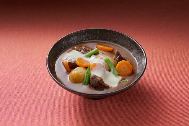 ビーフシチューをうま味たっぷりに仕上げるためには、タンパク質分解酵素のプロテアーゼが働きやすい60℃くらいから時間をかけて火を通すのが理想です。電子レンジでは食品の温度が一瞬にして100℃まで上がりがち。そこで、水にハヤシルウを加え、ルウの塩分に電磁波が吸収される仕掛けにし、肉の加熱時間が余分にかかるようにしておいしく仕上げています。
