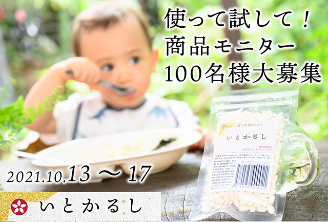 合同会社Kojemi(東京都豊島区池袋2-57-6MCオフィス池袋西口)は赤ちゃんから食べられる無糖ぽんがし【いとかるし】の商品モニター募集を行います。募集期間は2021年10月13日(水)~17日(日)の5日間。100名様に【いとかるし】1袋(500円相当)をご送付後、アンケート等を通してご意見・ご感想をお伺いいたします。