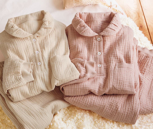 やわらかな綿100%甘撚りガーゼを贅沢に3 枚合わせた、ワッフル調の3 重ガーゼパジャマ。
