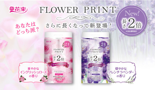 新型コロナウィルス感染拡大の影響により、ご自宅での滞在時間が増える中、おうちの中でも海外旅行気分を味わって欲しい、というコンセプトの元生まれ変わった「花束 フラワープリント トイレットペーパー」。より長巻き化を望むお客様のニーズにお応えするため、2倍巻きの12ロール(ローズ・ラベンダー)が新しくラインナップに加わります。