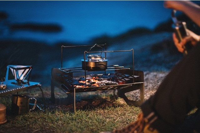 付属のゴトクを使用すれば、ケトルでお湯を沸かしたり、直火による調理が楽しめる。 スタンドと側面のパネルの両方に設置できる2WAY仕様となっており、火床の距離を変えることで火力を調節可能。炎を楽しみながら調理ができるとことも魅力です。