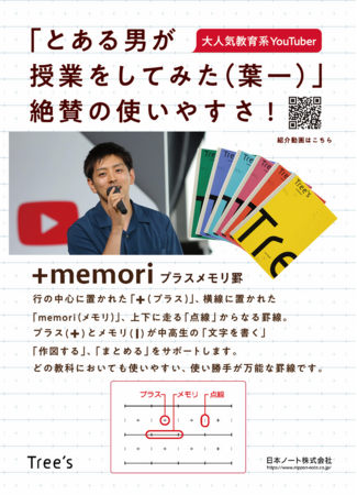 この度、スタンダードノートのブランド「Tree’s」より、学習に特化した“新プラスメモリ罫ノート”を新発売したことを記念致しまして、チャンネル登録者158万人(2021年10月配信日時点)を誇る、教育系YouTuberの「とある男が授業をしてみた(葉一)」さんとコラボレーションを行いました。コラボレーションでは、「とある男が授業をしてみた(葉一)」さんとのYouTubeタイアップを皮切りに、店頭のPOPにも出演頂きます。(2021年10月15日~2022年3月31日)是非、この機会に「Tree’s」を手に取っていただければ幸いです。